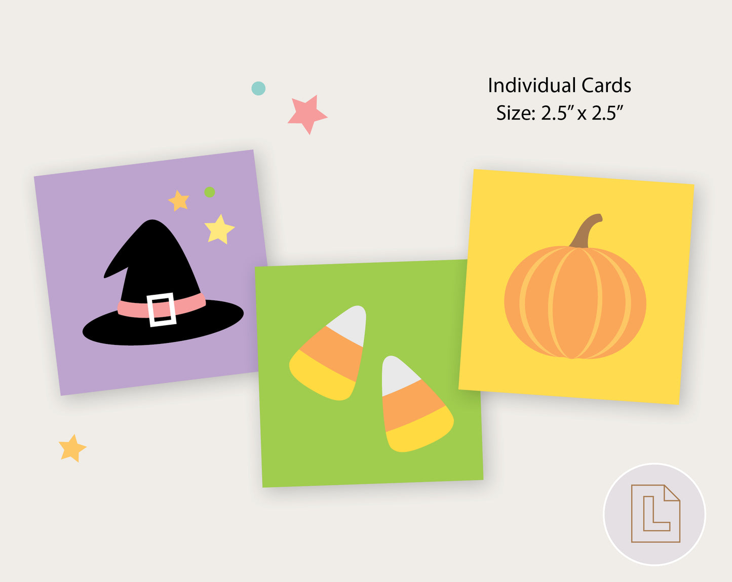 Have fun playing a game of Memory with this fun and adorable Halloween Memory Matching Game! Flip them face down and play a classic game of Memory or for younger toddlers, finding the matching pairs is a great activity for visual discrimination. There are 12 pairs of matching cards (24 total!) and also an option to print on the backside of the cards as well. These are a great addition to a Boo Basket or a Halloween activity basket.